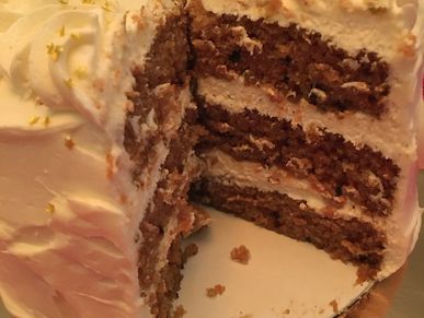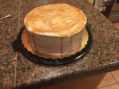 This is a six-inch, three-layer carrot cake iced and filled with cream cheese frosting. Customers love it because it's not too sweet and just the right size for a small gathering.