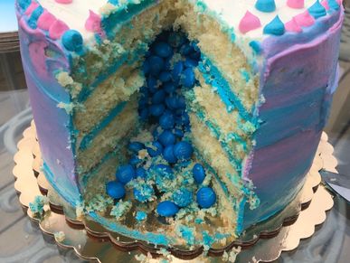 A tasty way to find out! This 4-layer lemon cake is iced in pink and blue buttercream, but once cut, colorful M&Ms pour out to reveal the baby's gender.