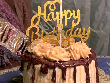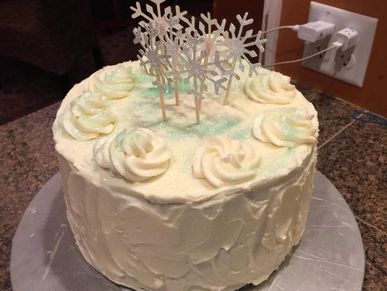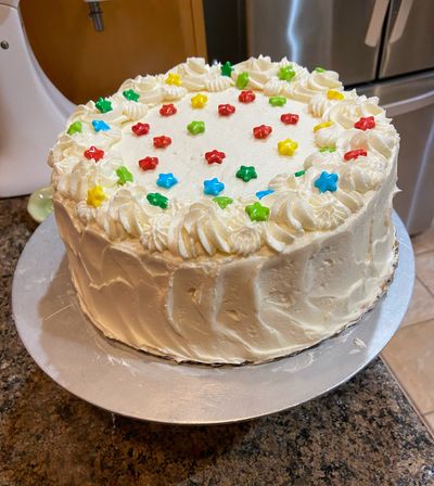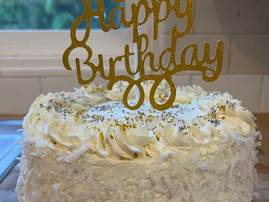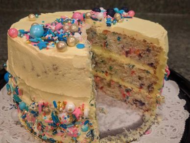 This Is a three-layer confetti cake, iced and filled with a rich vanilla buttercream. The cake is decorated with edible very special glitter. This is a wonderful birthday cake.