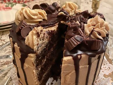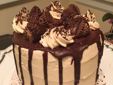 A three-layer yellow cake, frosted and filled with peanut butter icing and filled with chocolate ganache and miniature Reese's peanut butter cups.