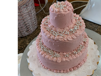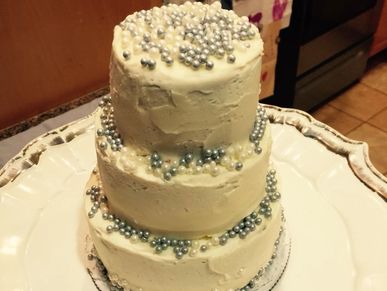 Made for the bride and groom to take home or share with the wedding party. The layers are 5 inch, 4 inch, and 3 inch and can be made in flavors the bride and groom choose. The cake is iced in a white vanilla buttercream which can be colored to match the wedding colors .