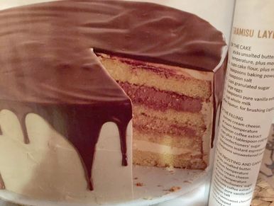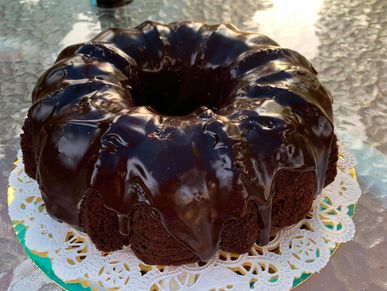 This cake is Many Moon’s signature cake. Four thin layers of yellow cake filled with cream cheese whipped cream, espresso, and chocolate filling and iced with a coffee flavored cream cheese frosting. The cake is then covered with a chocolate glaze.