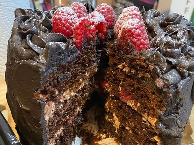 Four thin layers of moist chocolate cake filled with chocolate mouse and raspberries added. The cake can be iced with a chocolate ganache icing or a chocolate buttercream, and dusted with confectionary sugar. Or: Chocolate ganache