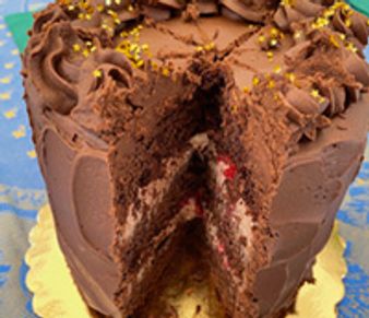 A three-layer, gluten-freec chocolate cake filled with a chocolate raspberry mousse and iced with a whipped chocolate ganache.
