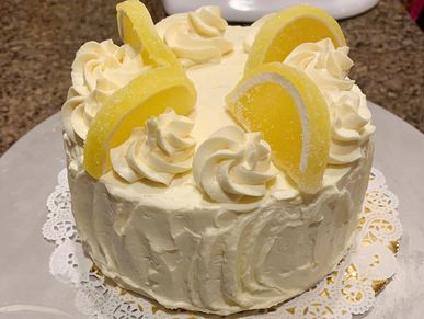 Four thin layers of lemon cake, filled with lemon curd and iced with a light lemon buttercream.