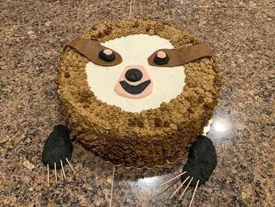 A two-layer yellow cake filled with a rich chocolate buttercream and covered with small chocolate stars. The face and feet are made of colored fondant. This has been a popular birthday cake.