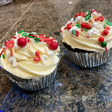 Red velvet holiday cupcakes frosted with white Godiva buttercream. A perfect complement to your holiday party.