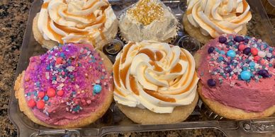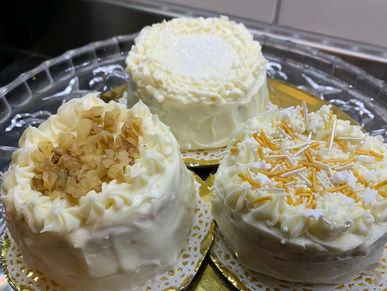 These two-inch layer cakes are perfect for Covid regulations, due to each cake being an individual serving. They are available in the following flavors: carrot, yellow, chocolate, and lemon. Each cake is iced and decorated.